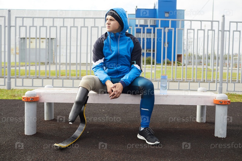 Серьезный хмурый одноногий бегун в голубой куртке с протезированной ногой сидит на скамейке снаружи и смотрит в сторону