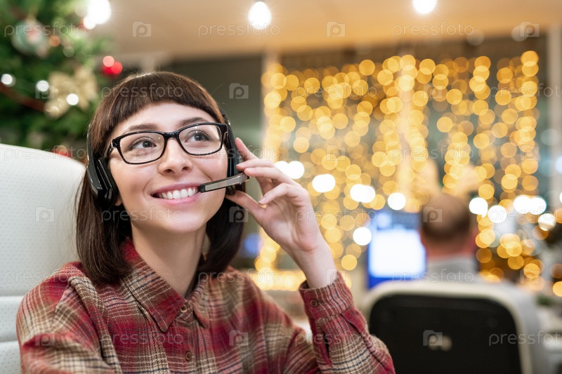 Счастливая молодая женщина-оператор с зубчатой улыбкой консультирует клиентов онлайн
