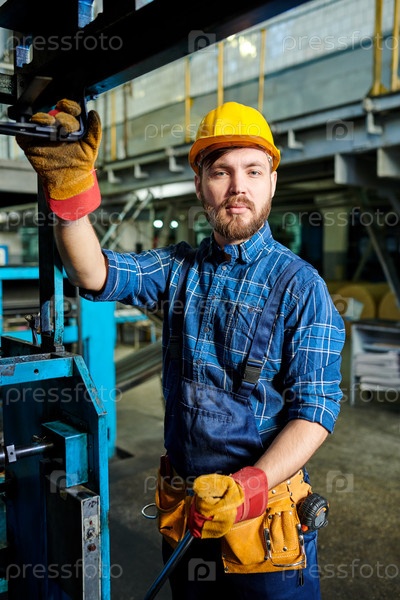 Серьезный молодой бородатый промышленный рабочий в жесткой шляпе и вообще стоял у фабричной машины и смотрел на камеру