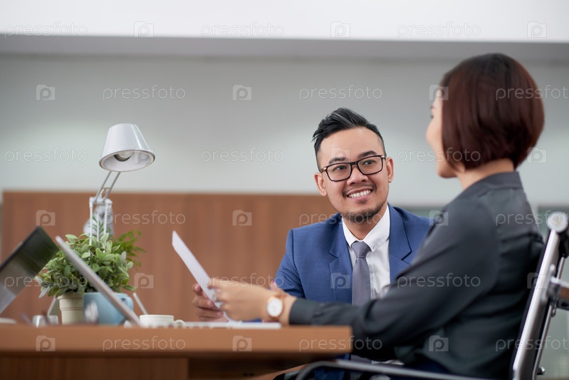 Коллеги по бизнесу разговаривают друг с другом в офисе