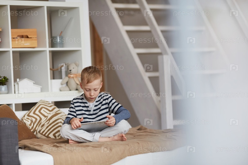 Серьезный маленький мальчик с светлыми волосами, сидящий со скрещенными ногами на кровати и выполняющий онлайн-задачи на планшете