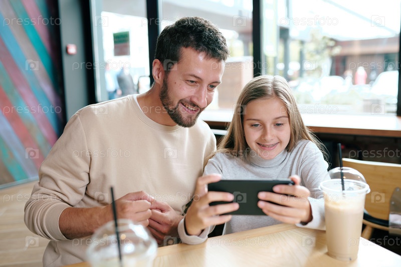 Счастливый молодой отец и его дочь смотрят смешное видео на смартфоне