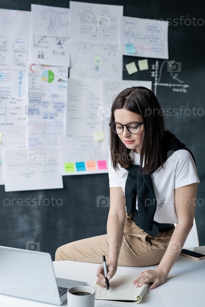 Молодая современная женщина-офисник, сидящая за столом и делающая записи