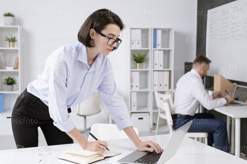 Уверенная в себе деловая женщина склоняется над столом перед ноутбуком во время сетевого общения