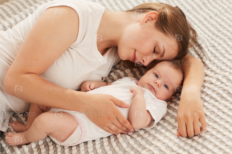 Усталая, но счастливая молодая красивая женщина спит в кровати со своей новорожденной дочерью