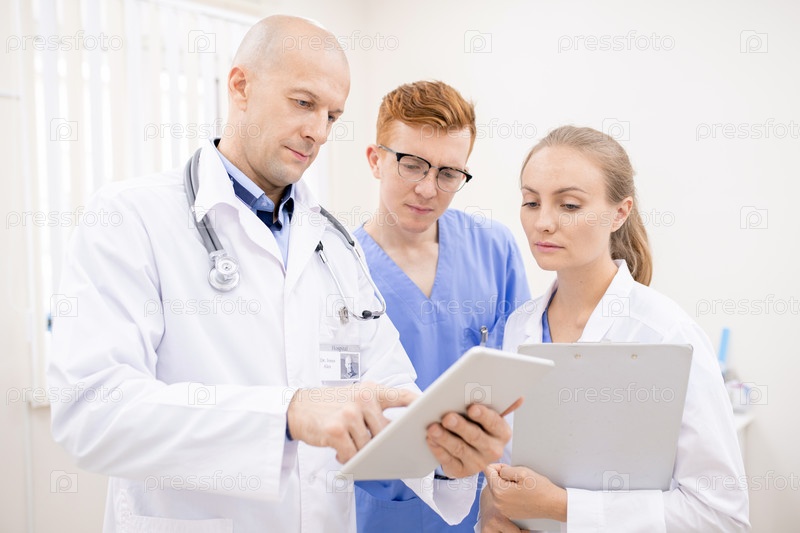 Клиник среднего возраста с сенсорной панелью делает презентацию двум молодым интернам