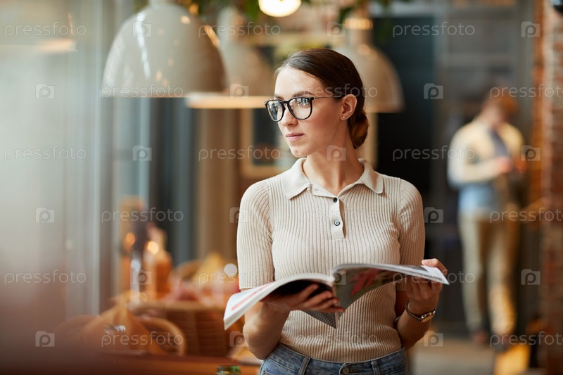 Пенсив вдохновил привлекательного репортера журнала с очками, стоящего в уютном кафе и читающего собственную статью в журнале