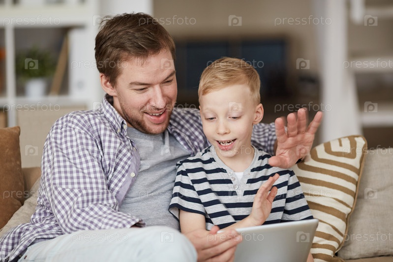 Позитивный красивый отец и его сын сидят на диване и машут руками к планшету, разговаривая с матерью через приложение видеочата