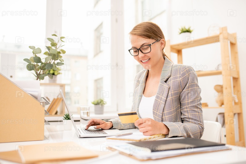 Красивая молодая офисная работница смотрит на кредитную карту, делая онлайн-заказ