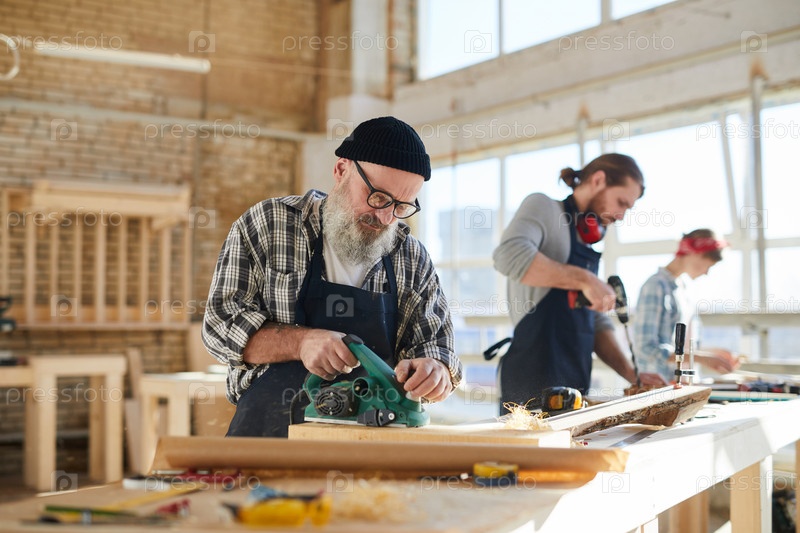 Концентрированный старший бородатый плотник в шапке и очках, стоящий за столом и использующий шлифовалку на мастерской