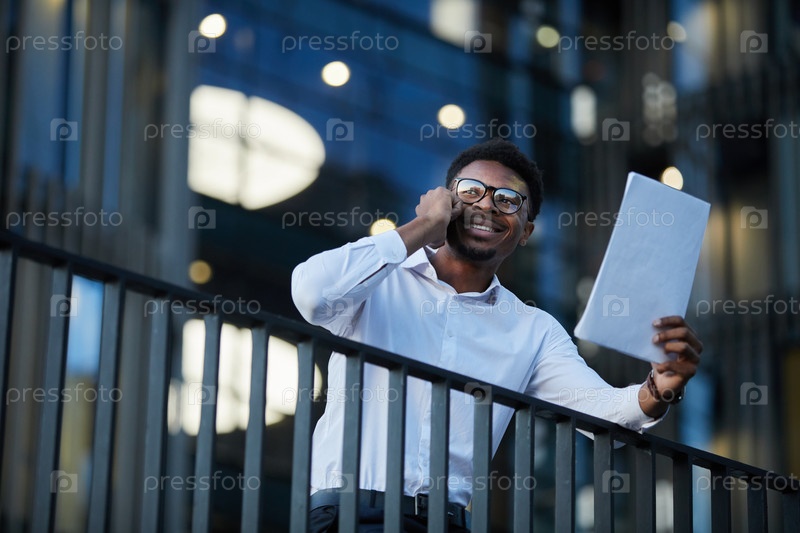Веселый, взволнованный молодой чернокожий бизнесмен с очками стоит на балконе делового центра и держит бумаги во время разговора по телефону