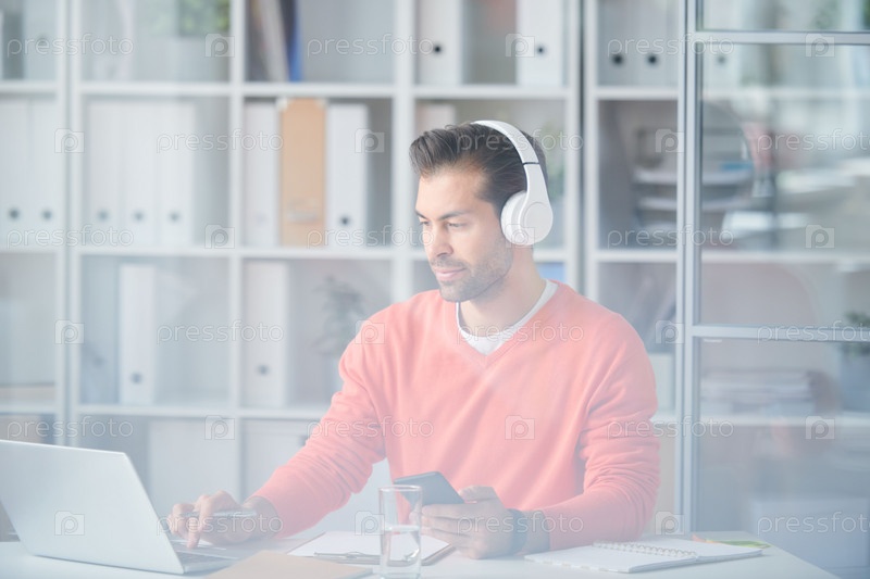 Случайный молодой бизнесмен в наушниках с использованием современных гаджетов