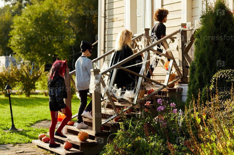 Дети, поднимающиеся по лестнице на Хэллоуин