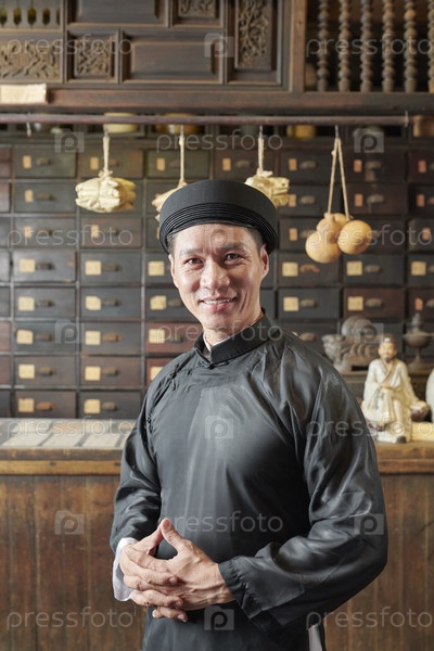 Азиатский мужчина работает в старой китайской аптеке
