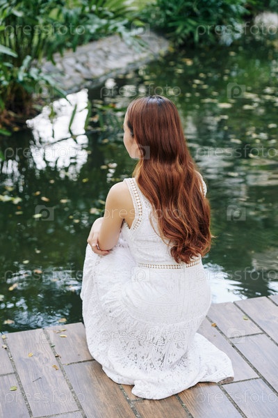 Женщина отдыхает у пруда в парке