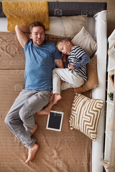 Высокоугольный вид улыбающегося молодого отца и его милого сына, отдыхающих на диване с планшетом