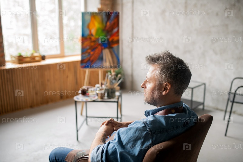 Размышляющий и спокойный художник средних лет в рабочей одежде, сидящий на кресле