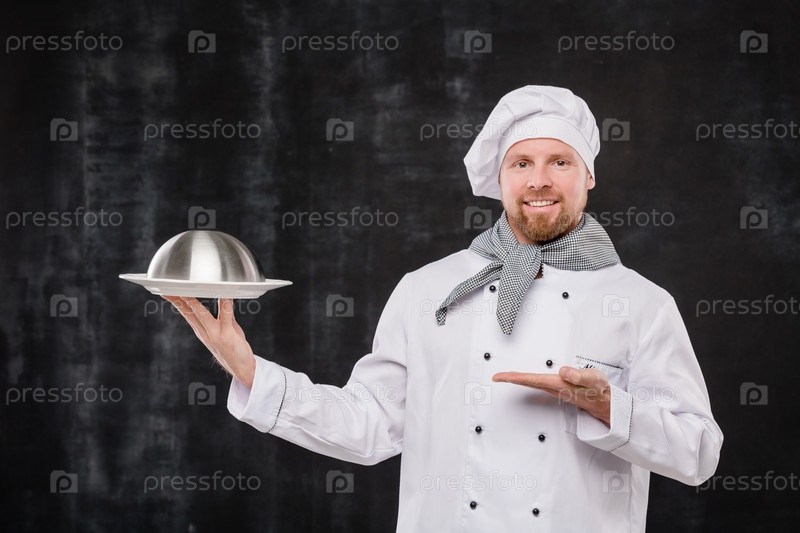 Счастливый бородатый шеф-повар ресторана в белой форме, указывающий на колош с едой