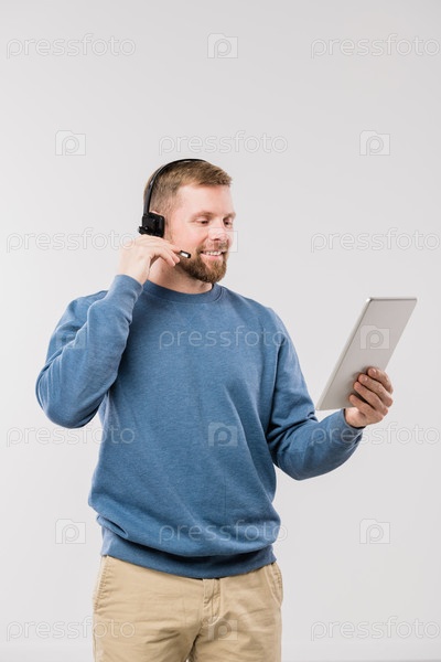 Счастливый молодой оператор с гарнитурой и сенсорным панелем консультирует клиентов онлайн