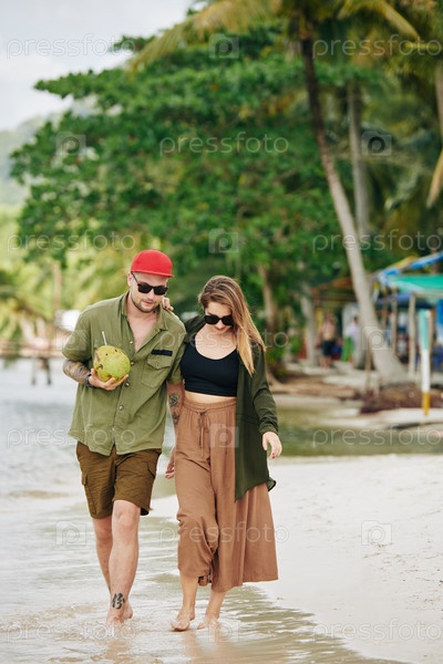 Молодая пара гуляет по пляжу