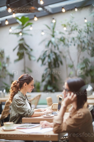Молодая женщина использует ноутбук в кафе