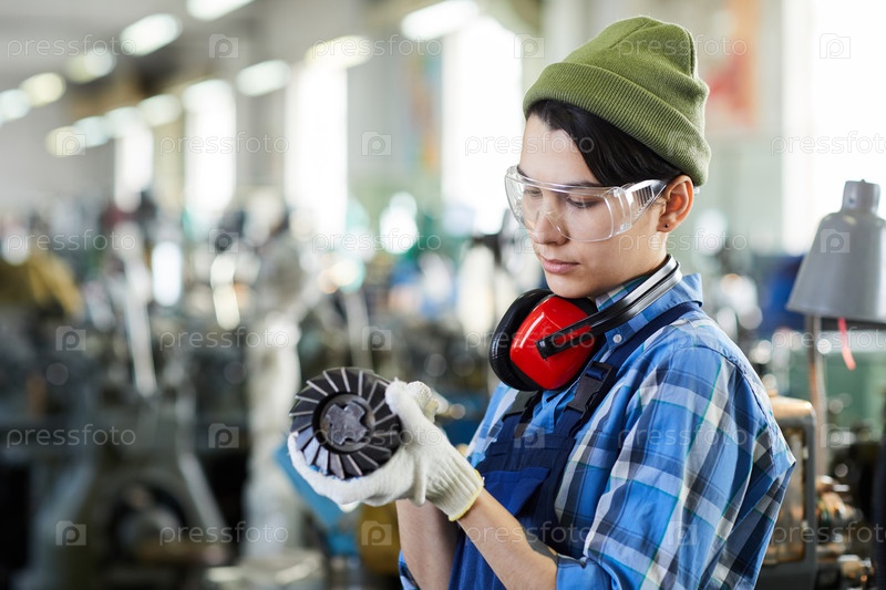 Концентрированная жесткая леди, занятая в сфере промышленного ремонта, стоит на фабрике и смотрит фрезерный резак