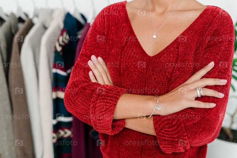 Молодая элегантная женщина в красном вязанном пуловере, скрестившая руки за грудь