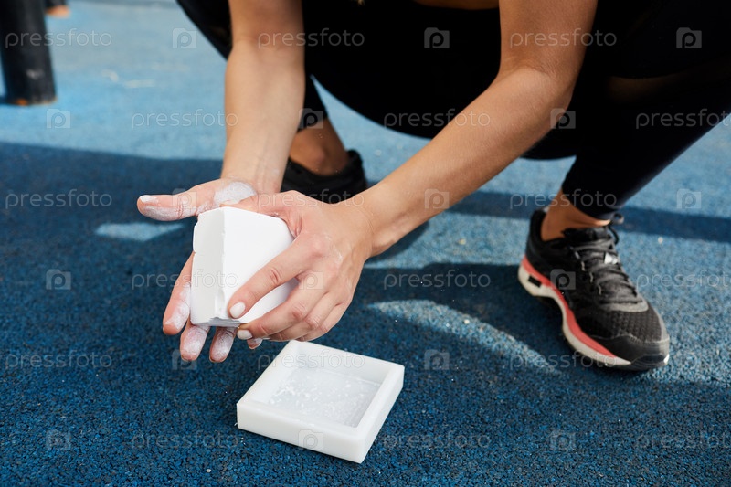 Близкий план неузнаваемой женщины, прислонившейся и использующей гимнастический мел для нанесения его на руки перед силовыми упражнениями