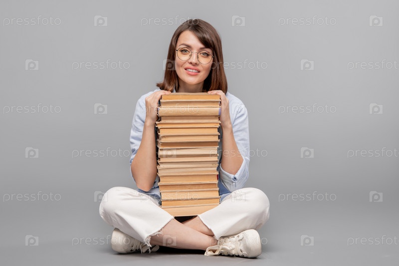 Молодая умная студентка, сидящая на полу с высоким столом книг