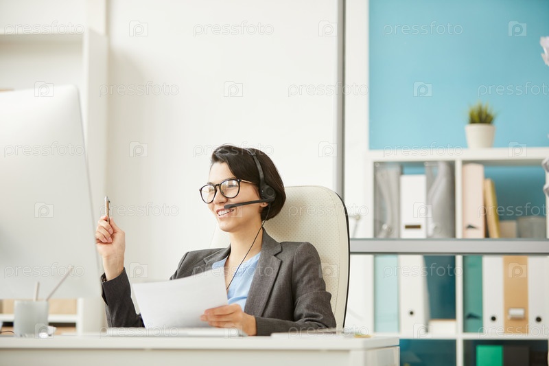 Веселая молодая брюнетка бизнес-специалист сидит за столом и обсуждает документы с коллегой, используя онлайн-приложение для совещаний на компьютере