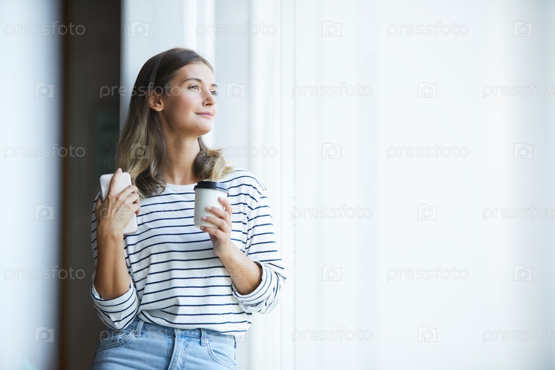 Содержание мечтательная молодая леди в повседневной одежде, держащая смартфон и чашку кофе при взгляде из окна