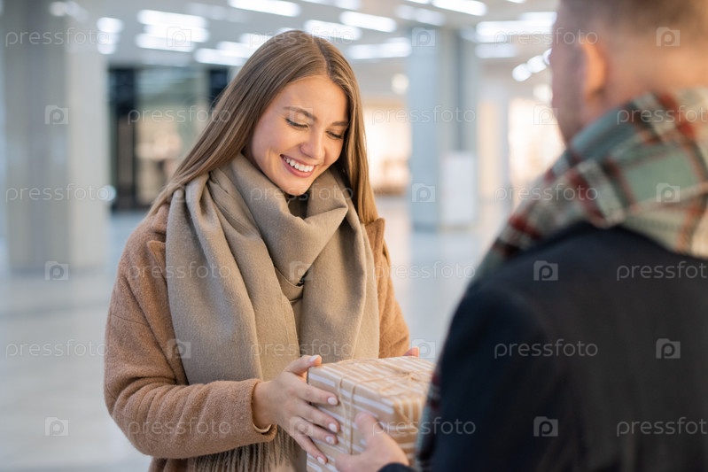 Счастливая девушка смотрит на коробку с подарками и берет ее из рук своего парня