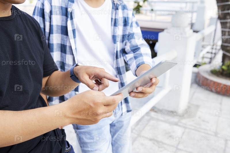 Молодые мужчины с планшетным компьютером на открытом воздухе