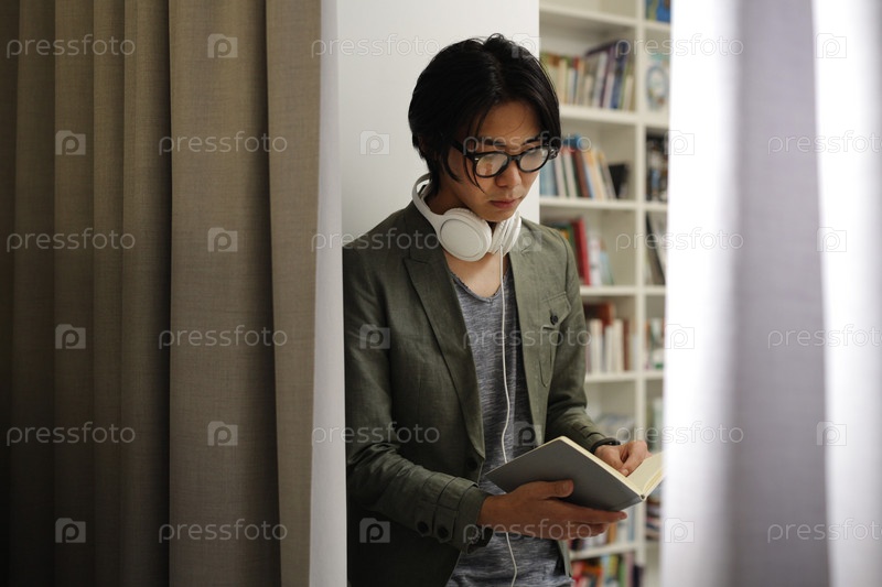 Мужчина читает книгу в библиотеке