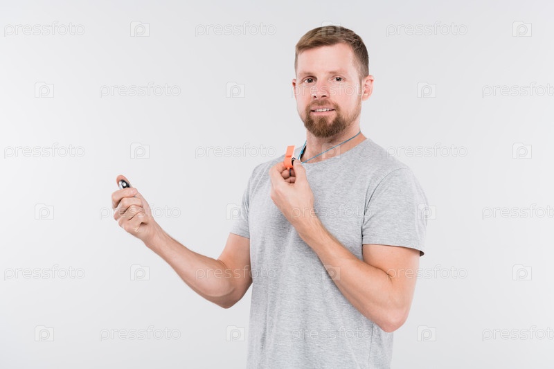 Бородатый молодой спортивный тренер или судья с свистом смотрят на вас