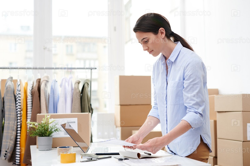 Молодой менеджер онлайн-магазина повседневной одежды просматривает листовки для клиентов