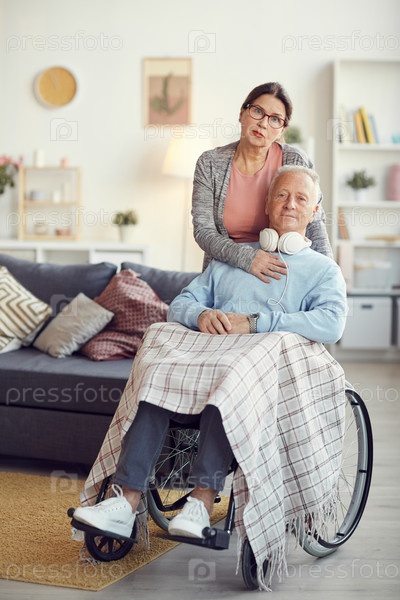 Портрет серьезной привлекательной жены в очках, которая обнимает своего мужа-инвалида с наушниками и сидит на инвалидном кресле