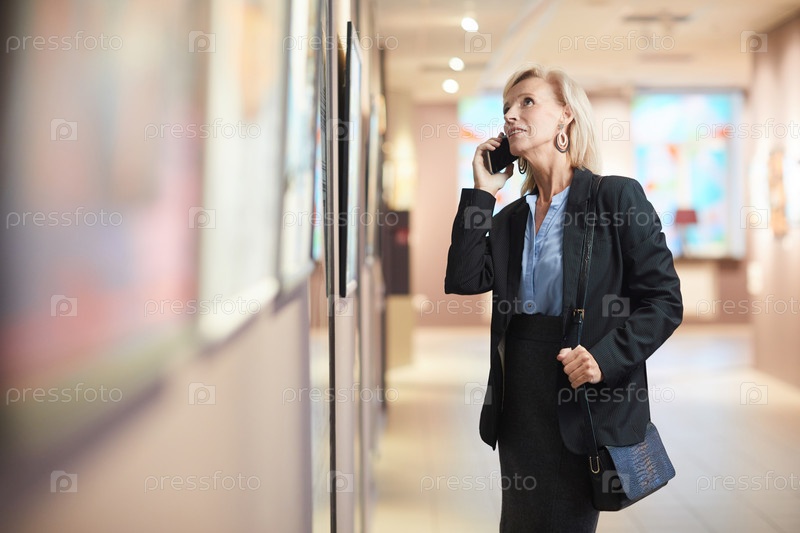 Зрелая деловая женщина смотрит на картины в художественной галерее
