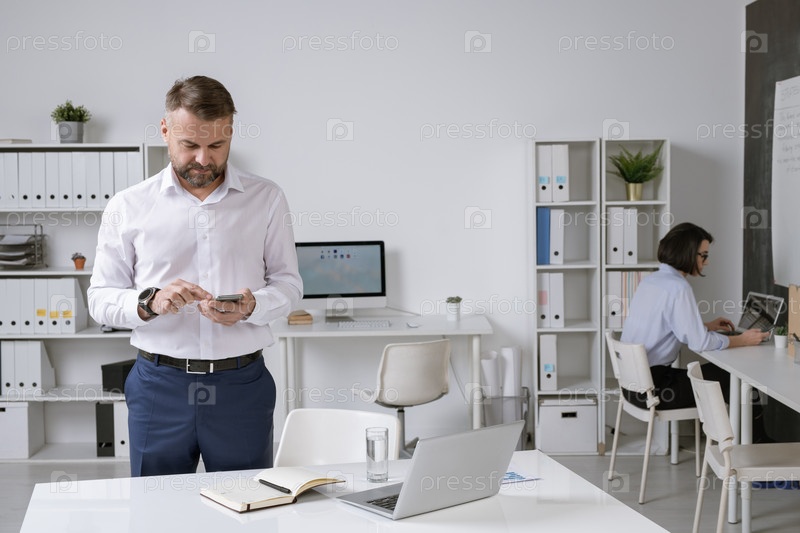 Успешный бизнесмен в формальной одежде прокручивает смартфон для контакта