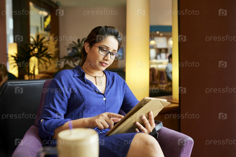 Молодая женщина использует цифровой планшет в кафе