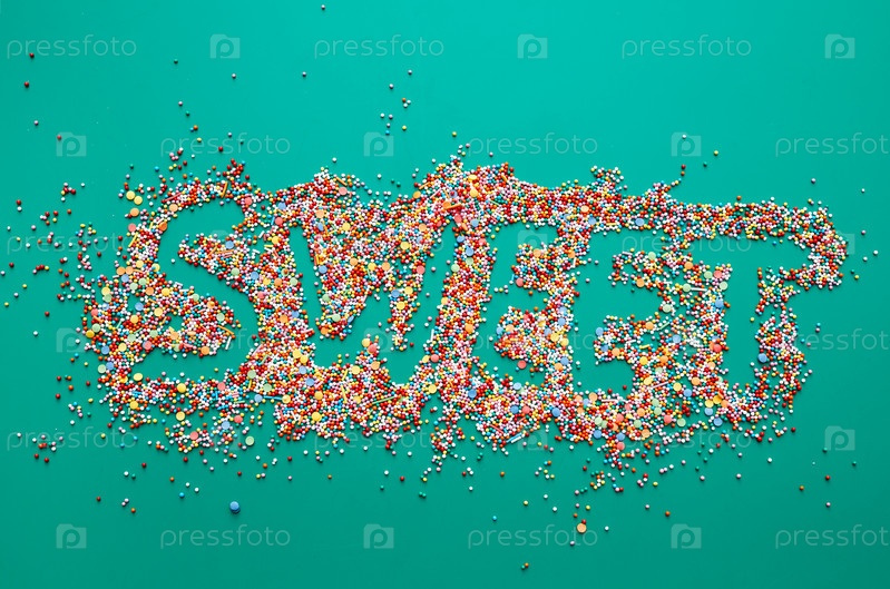Сладкая надпись написана на красочных посыпаниях, зеленый фон