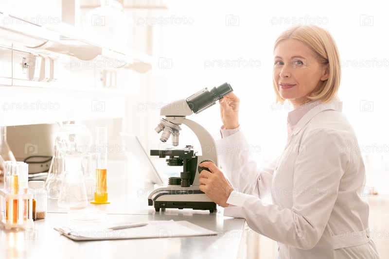 Улыбающаяся зрелая леди в лаборатории