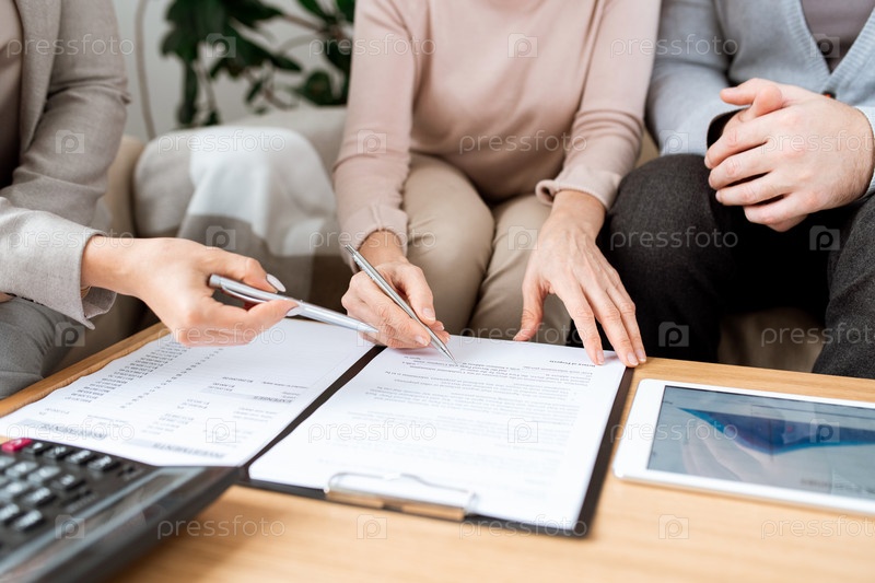 Молодой агент объясняет зрелым клиентам, где подписать контракт после переговоров
