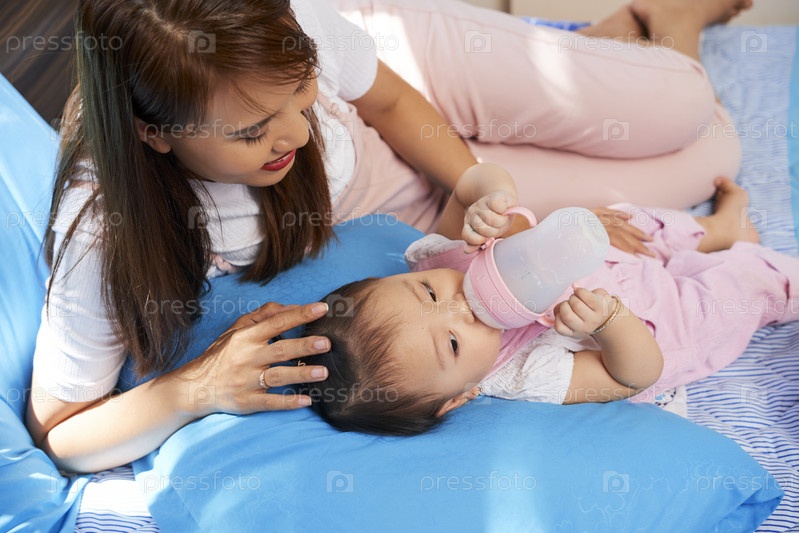 Мать кормит ребенка детской смесью