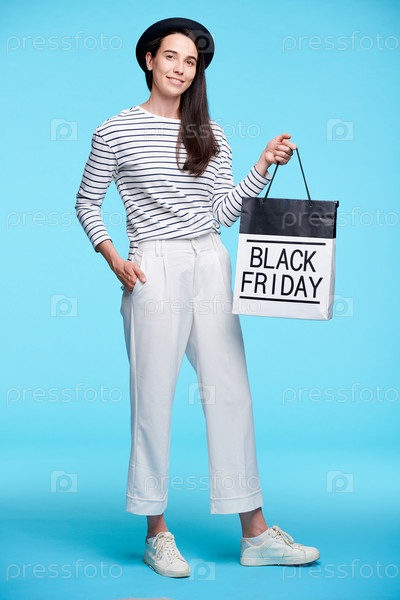 Молодая покупательница в стиле smart casual, хвастающаяся покупкой на черную пятницу