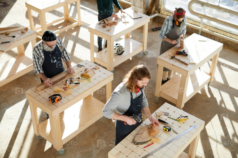 Серьезные концентрированные фабричные плотники в фартуках, стоящие за столами и работающие с деревом