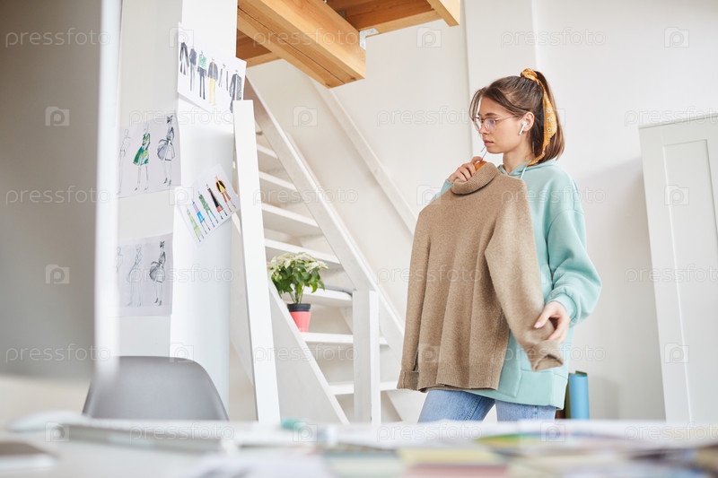 Серьезная привлекательная девушка с волосами шарф конный хвост, стоящий перед зеркалом и пробующий свитер в студии портцов