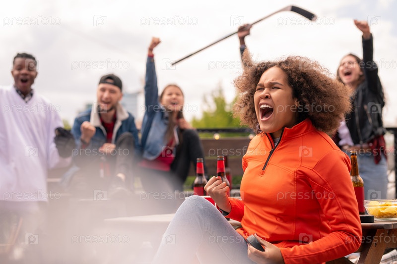 Эмоциональные друзья, болеющие за свою любимую хоккейную команду