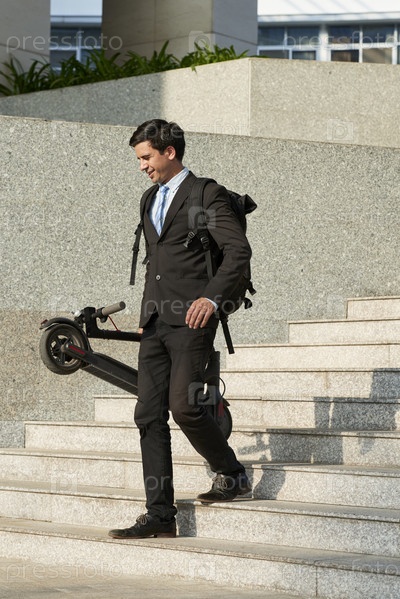 Бизнесмен с скутером ходит по городу