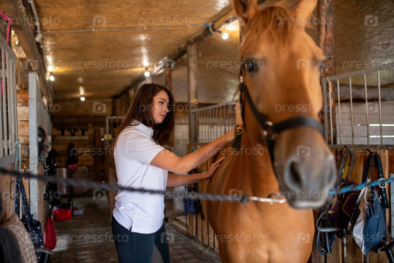 Красивая молодая спортсменка ухаживает за своей скаковой лошадью, пока чистит спину